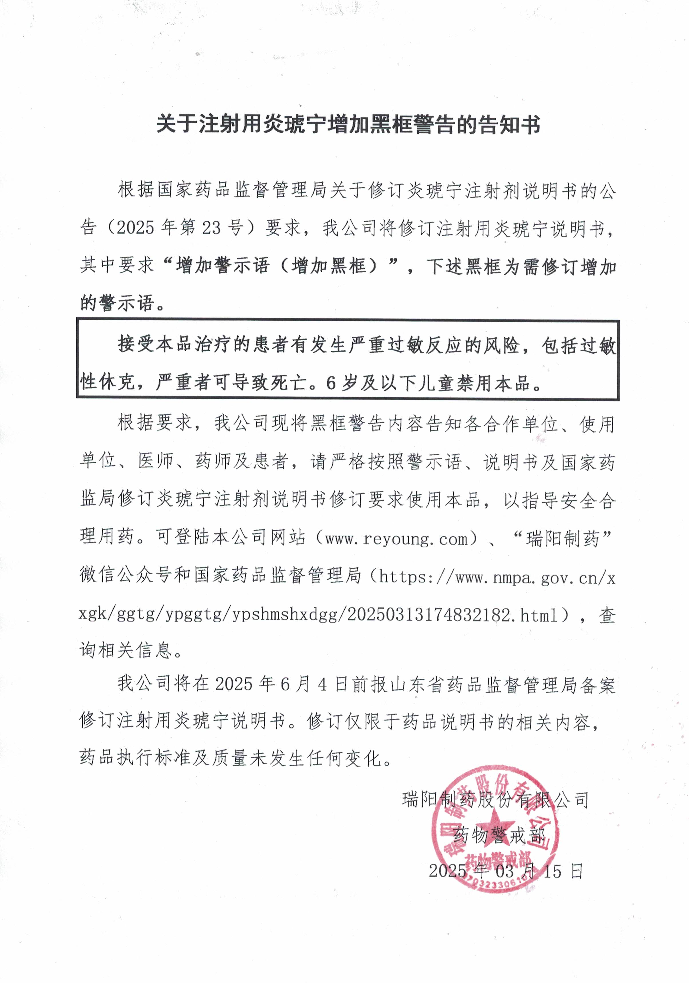 关于注射用炎琥宁增加黑框警告的告知书