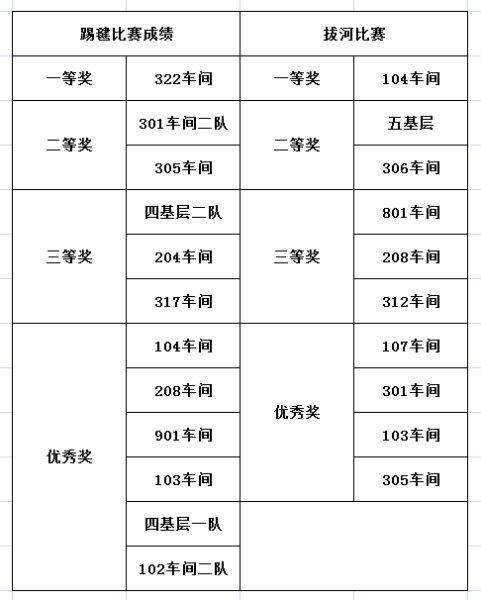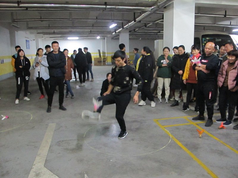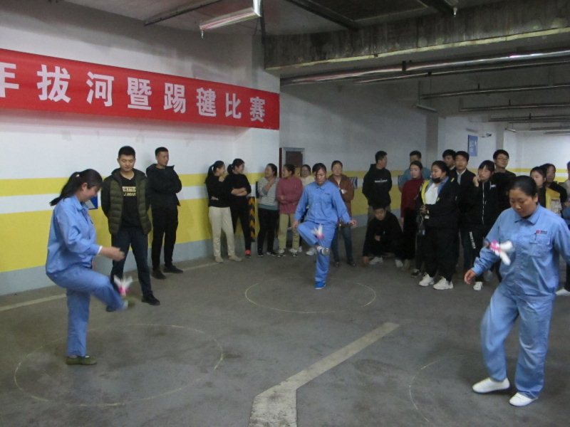 踢毽比赛为限时赛,采取2分钟计时,每队5人,同时在各自1.5米的范围内踢毽, 5人的总体成绩为团队比赛成绩。比赛中,毽子在参赛者脚上翻飞起落,单脚踢,左右脚对踢,内踢外翻,花样不断,不时赢得现场阵阵喝彩,整场比赛场面紧张激烈。经过比拼,最终322车间代表队获得踢毽比赛一等奖。